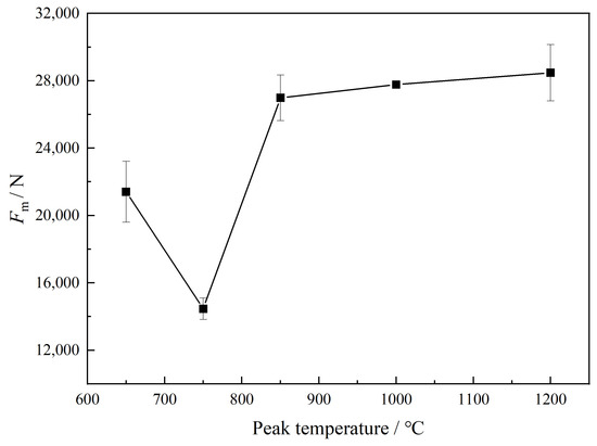 The Fm values of the test steel at −40 °C under different secondary thermal cycle peak temperatures.