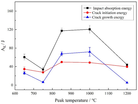 Further comparison of the impact energy absorption at different secondary peak temperatures was conducted. The average impact energy absorption of the base metal of the test steel at −40 °C is 124 J. According to Table 2, when the secondary peak temperature in the heat-affected zone (HAZ) of the weld is 650 °C, the impact energy is 60.5 ± 6.5 J, which is 50% lower than that of the base metal. At 750 °C, the impact energy absorption is 33.7 ± 4.8 J, representing a 73% reduction compared to the base metal. When the peak temperatures are 850 °C and 1000 °C, the impact energies are 117.5 ± 5.4 J and 120.65 ± 8.5 J, respectively, which are basically consistent with those of the base metal. Therefore, in the HAZ of the test steel, the material can still maintain good toughness when the secondary peak temperatures are 850 °C and 1000 °C. The trends in crack initiation energy and crack propagation energy are the same as those in impact energy absorption.