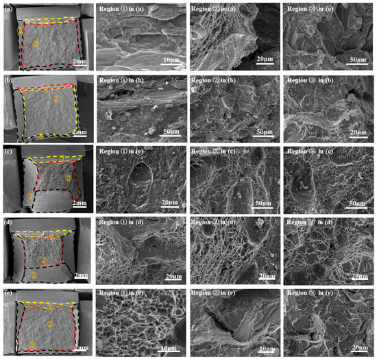 Impact fracture morphology of test steel at different peak temperatures of one thermal cycle: (a) 650 °C; (b) 750 °C; (c) 850 °C; (d) 1000 °C; (e) 1200 °C.