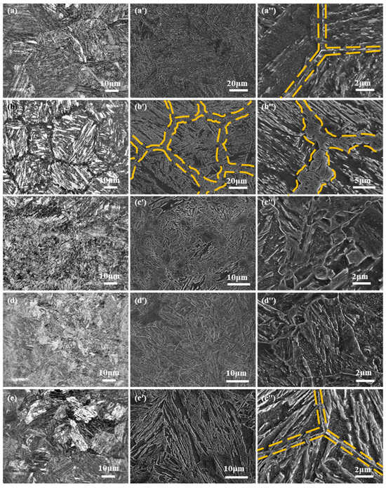 OM and SEM microstructure of steel at different peak temperatures of secondary thermal cycles: (a,a’,a”): 650 °C; (b,b’,b”): 750 °C; (c,c’,c”): 850 °C; (d,d’,d”): 1000 °C; (e,e’,e”): 1200 °C. The grain boundaries were marked with yellow lines.