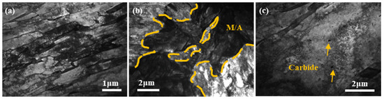 TEM of the tested steel after a secondary thermal cycle with a peak temperature of 1000 °C. (a) Lath bundles arranged in multiple orientations; (b) blurred lath edges; (c) carbides.