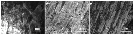 The sample preparation method was as follows. Firstly, a thin slice of approximately 300 μm thick was cut from the sample using wire electrical discharge machining. This slice was then mechanically ground to a thickness of 50–80 μm and subsequently punched into a small round disk with a diameter of 3 mm. After that, twin-jet electro-polishing was performed on the MTP-1A (Yulong Technology, Ltd., Beijing, China) instrument, with specific process parameters, including a temperature of −20 °C and a polishing voltage of 70 V. The polishing solution consisted of 10% perchloric acid in ethanol by volume.