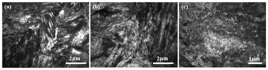 Further observations on the fine structure of the tested steel were conducted using transmission electron microscopy, with the results presented in Figure 9, Figure 10, Figure 11, Figure 12 and Figure 13. At 650 °C, the lath bundles were elongated and slender, with widths ranging from approximately 0.5 to 1 μm. The lath boundaries were distinct, and granular M/A phases were distributed along the grain boundaries and lath boundaries. High-density dislocations were visible, accompanied by a relatively large number of carbides. When the peak temperature rose to 750 °C, compared to the subcritical coarse-grained region, the lath widths in the intercritical coarse-grained region increased slightly to about 1 μm, with clear boundaries. The M/A phases on the lath boundaries were distributed in blocky forms, with widths exceeding 5 μm. As the peak temperature continued to rise, partial recrystallization occurred in the steel at 850 °C, resulting in blurred lath edges and smaller grain sizes. When the peak temperature increased to 1000 °C and 1200 °C, the laths exhibited a multi-directional arrangement, with reduced lengths, blurred edges, and smaller grain sizes.