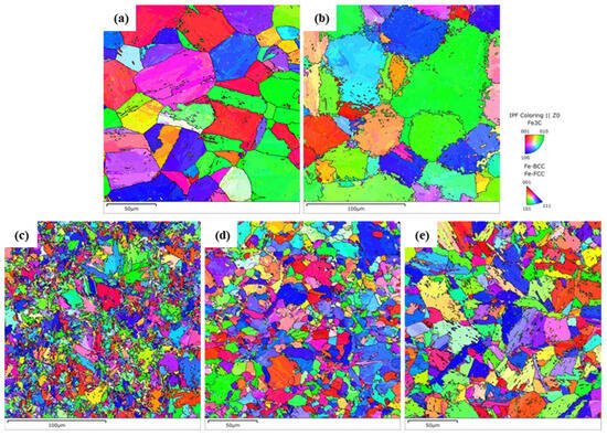 Results of parent phase grain reconstruction for the tested steel at different peak temperatures of secondary thermal cycles: (a) 650 °C; (b) 750 °C; (c) 850 °C; (d) 1000 °C; (e) 1200 °C.
