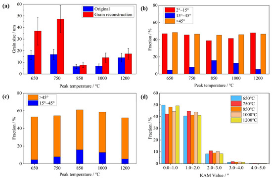 Regarding grain size, the grain sizes at 650 °C, 750 °C, 850 °C, and 1000 °C were 16.43 μm, 16.83 μm, 6.53 μm, and 6.9 μm, respectively. It can be observed that with the occurrence of recovery and recrystallization, the grain size continued to decrease. When the peak temperature rose to 1200 °C, the grain size increased again to 14.05 μm, which was similar to that in the primary coarse-grained region. Overall, there was a trend of decreasing first and then increasing. For the proportions of grain boundaries with misorientations above 15° and 45°, they both showed a trend of first increasing and then decreasing at the five peak temperatures, with the highest proportions occurring at 850 °C, which was consistent with the smallest grain size at this temperature.