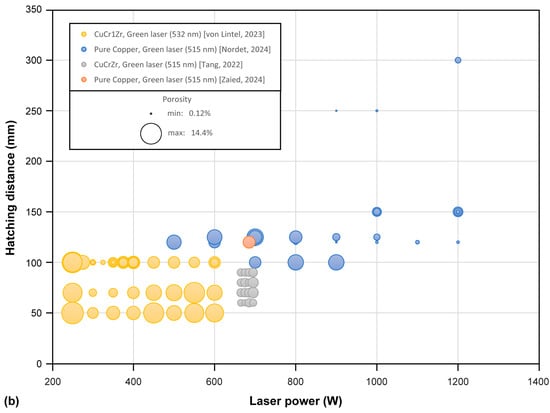 | Pure copper | Hatching distance [µm] | 100-120-125-150-300 | 91.6–99.88% | Maximum densification rates are achieved at scan speeds of 400–500 mm/s and laser power higher than 600 W, resulting in improvements of up to 0.3% compared to those obtained with IR lasers. Additionally, a scan speed threshold of approximately 500 mm/s is recommended to prevent process instabilities and porosity | [46] |