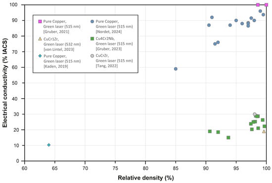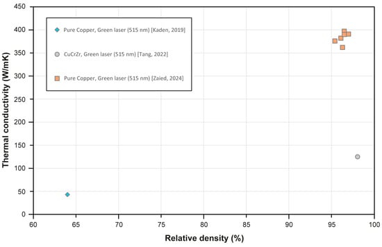 | Material | Heat Treatment | Relative Density [%] | Electrical Conductivity [% IACS] | Thermal Conductivity [W/mK] | Ref. |