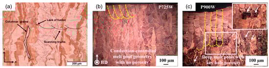 | ↑ Laser power | ↑ Density ↑ Degrees of texture ↑ Grain columnarity ↑ Melt pool depth | [43,44] |