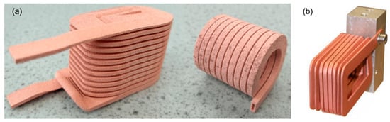 - Martin, J.D. Exploring Additive Manufacturing Processes for Direct 3D Printing of Copper Induction Coils. In Proceedings of the ASME 2017 International Mechanical Engineering Congress and Exposition, Tampa, FL, USA, 3–9 November 2017. [Google Scholar]