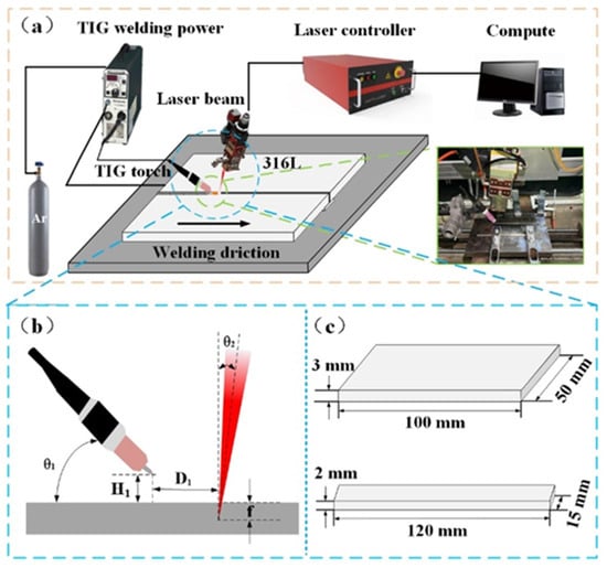 (a) Schematic of the laser–TIG hybrid welding system; (b) schematic of the positional relationship between the laser and the arc; (c) dimensions of the butt plate and the bottom pad plate.