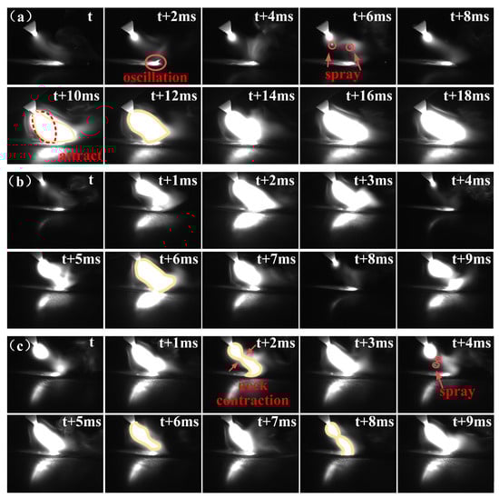 High-speed photographic images at different pulse frequencies: (a) 50 Hz; (b) 250 Hz; (c) 500 Hz.