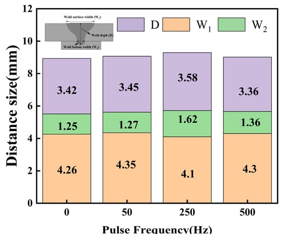 To investigate the effect of pulse frequency on the macroscopic morphology of the weld, the melt width (W1) at the surface of the weld, the melt width (W2) at the bottom of the weld, and the depth of the weld (D) were investigated with different pulse frequencies, as shown in Figure 5. With an increase in pulse frequency, W1 shows an increasing trend and then a decreasing one; the maximum melt width occurs when the frequency is 50 Hz. The bottom melt width W2 is largest at 250 Hz, measuring 1.62 mm. This melt width at the bottom influences the mechanical properties of the joint [,]. The melt depth of the weld increases with pulse frequency, but the variation is not significant. The overall width of the weld (W1 + W2) shows an increasing trend, so the fusion zone area gradually increases with the pulse frequency.