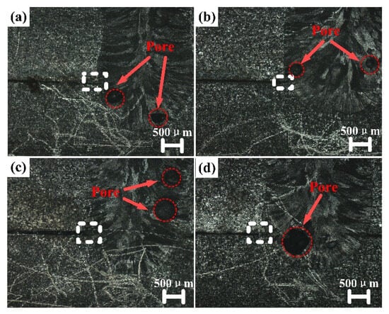 Figure 6 shows the cross-sectional morphology of the joint at different pulse frequencies. The fusion zone shows porosity defects, and with an increase in pulse frequency, as shown in Figure 6a–c, the location of the porosity gradually ascends from the base of the molten pool, while the size of the porosity decreases. This is because the increase in pulse frequency improves the stability of the arc, and the flow of the molten pool is further enhanced. The pores that form at the bottom of the molten pool are affected by the pool’s flow. The pores gradually rise during solidification, and with a better flow, the pores overflow to the top of the molten pool, which in turn creates the tendency for the positions of the pores to rise gradually []. However, a high frequency leads to arc instability, resulting in oscillation within the melt pool. This subsequently impacts the overflow of pores to the top of the melt pool, and the instability of the melt pool results in larger pores that appear and fail to overflow in time [], as shown in Figure 6d. The formation of these pores is primarily associated with the flow of the melt pool before solidification, which will be discussed later.