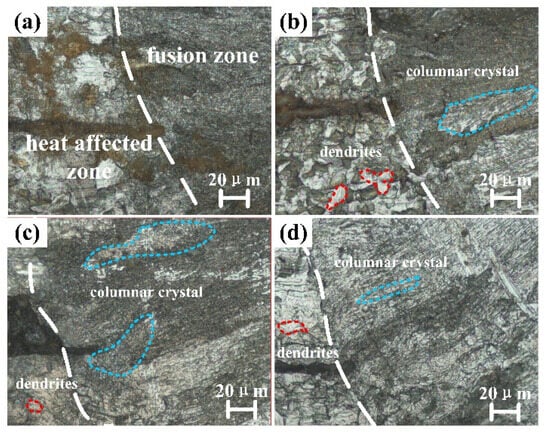 To further investigate how varying pulse frequencies influence the microstructure, the microstructure within both the fusion zone and the heat-affected zone is investigated at different frequencies. Figure 7a–d show enlarged views of the fusion line (the white box area) in Figure 6. In the figure, with the increase in the pulse frequency, the microstructure of the fusion zone changes from columnar crystals to slat-like dendritic crystals, and the grain size of the heat-affected zone also decreases gradually. This is due to the introduction of the pulsed arc, resulting in a faster alternation of heat and cold in the molten pool, which improves the cooling rate and inhibits the growth of the grains [,].