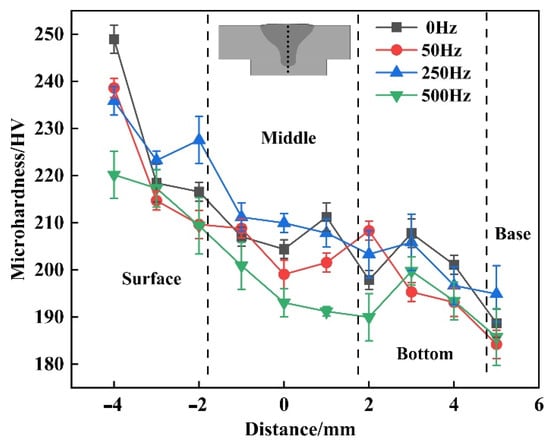 The hardness distribution of the joint cross-section is shown in Figure 8. The hardness of the upper surface area of the weld in the joint is the highest. Along the depth direction of the weld, the hardness value shows a decreasing trend.