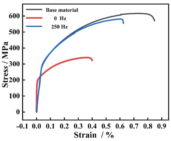 The tensile properties of the specimens were analyzed, as shown in Figure 9. For all joint fractures, the joint’s ultimate tensile strength measured at 0 Hz was 348 MPa, which is a 43% decrease in strength compared to the parent material (616 MPa). When the frequency is 250 Hz, the ultimate tensile strength of the joint is 581 MPa, which is close to that of the base material. The ultimate tensile strength is strongly affected by porosity [].