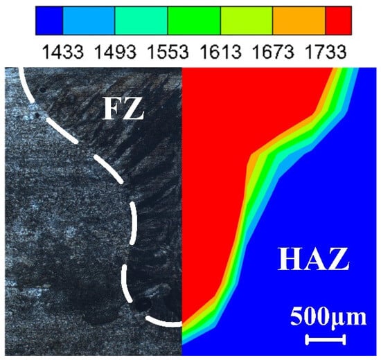 The model is calibrated by comparing it with experimental results. The calculated temperature field results of the weld cross-section at 0 Hz are shown in Figure 13. The shape of the weld fusion zone is formed with a solid-phase line temperature of 1693 K, and the shape of the weld is in the shape of an “inverted bell”, which exhibits the properties of both the laser and arc heat sources.