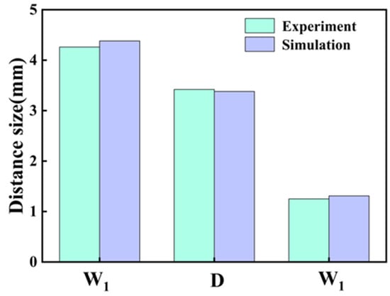 The experimental and calculated melt width (W1) at the surface of the weld, the melt width (W2) at the bottom of the weld, and the melt depth (D) were compared and analyzed, as shown in Figure 14. The simulation errors of the upper weld width, the weld depth, and the lower weld did not exceed ±0.15 mm, ±0.04 mm, or ±0.06 mm, respectively. The calculated results align well with the experimental results.