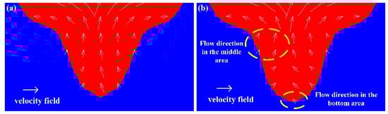 Flow field of the molten pool at different pulse frequencies: (a) 0 Hz; (b) 250 Hz.
