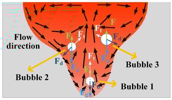 Figure 17 shows a schematic of the laser–TIG hybrid welding molten pool. The hybrid heat source acts on the liquid metal at both ends of the molten pool’s downward flow. After reaching the bottom of the molten pool, the heat is subjected to the reaction force of the solid–liquid interface on the molten pool and flows back toward the surface. Under the action of the laser, bubbles are formed at the bottom of the molten pool, affected by the liquid metal in the molten pool, with certain changes in force [].