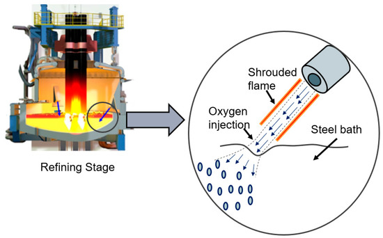 The refining stage reactions are controlled by the local concentration of species and flow properties of the liquid steel. These reactions can be enhanced by stirring forces as they increase the flow by mixing. For this reason, technologies such as O2 injection through lances, bottom gas injection (BGI), and electromagnetic stirring (EMS) are applied in the refining stage [3]. The BGI technology is extensively applied in ladle furnaces. However, the application of BGI to EAF operation has challenges. These challenges are related to the height of the molten steel, which is variable in the EAF case, and the low ratio of liquid height to furnace diameter seen in EAF as compared to the ladle (3–5 times lower). As a result, large spouts may form at the bath surface in EAF, which affects the arc stability [3]. The EMS concept is an old one, but it has not been extensively commercialized in EAFs. Electric arcs in EAF generate electromagnetic forces, although these forces are weak. The installation of coils at the bottom of the EAF, where low-frequency current is applied, has demonstrated a significant stirring impact on the molten bath [4]. Recent implementations of EMS in EAF have shown significant improvements in thermal stratification, decarburization rates, and electrode consumption [5]. However, as mentioned earlier, EMS technology is not widely implemented. A well-established technology used in the refining stage of EAF is oxygen injection from lances. In this case, oxygen is injected into the molten steel through jets located above the liquid steel in order to stir it, remove impurities, and provide the right slag foaming. Once the injected oxygen dissolves in the liquid steel, the oxygen reacts with the carbon in the liquid to generate in-bath oxygen and CO bubbles, which generate turbulence and further stir the molten bath [6].