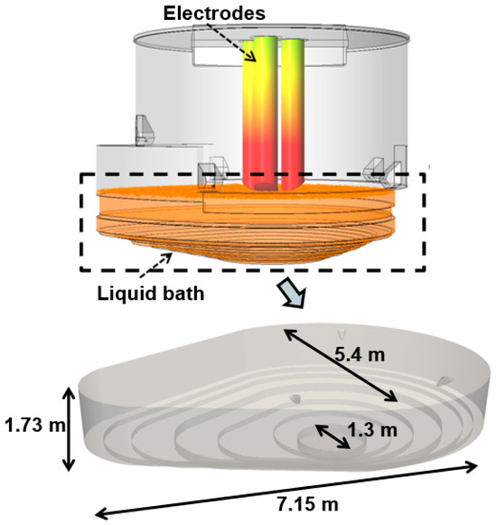 Liquid bath region considered in the CFD refining simulations, including the dimensions of the CFD domain.