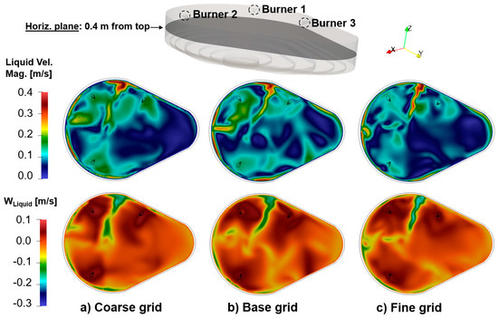 A grid resolution study was performed on the computational setup shown in Figure 2. Namely, a case with the same operation conditions was repeated by using a coarse (0.3 million cells), a base (0.6 million cells), and a fine grid (1.3 million cells). The results obtained at a plane located 0.4 m from the top (close to the oxygen injection burners) are shown in Figure 3. The top set of contours shows the liquid velocity magnitude, whereas the lower ones show the velocity in the vertical direction. All three grids show similar flow structures. In particular, regions with large velocity magnitudes are observed between burners 1 and 3, and a reduced velocity flow develops near the balcony. Moreover, the three grids develop similar flow fields of the vertical velocity component (WLiquid), which show the impact of the jets on the vertical acceleration.