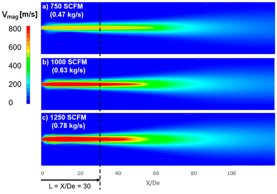 The coherent jet CFD model is used to obtain the flow velocity and oxygen mass fraction of the gas injected by the burners (operating in lance mode) when it reaches the molten bath. As explained in Section 2.1, the flow features produced by the injected gas are used to compute the cavities that jets produce in the bath, which are part of the computational domain used in the refining simulations. Figure 4 shows the velocity magnitude contours generated by the three injection rates considered in this study: 750, 1000, and 1250 SCFM. The dashed line shows the location at which the flow profile is obtained. The flow profile information at this location is then used in the calculation of the bath cavities by using the procedure explained in Section 2.3. The distance from the left boundary to the dashed line (L = X/De = 30, where De is the diameter of the jet) corresponds to the distance from the tip of the burner to the surface of the molten bath.