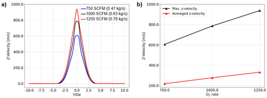 Results obtained by coherent jet model for O2 rates considered in this study: (a) Z-velocity profiles computed vertically (Y/De direction) at X/De = 30, and (b) maximum and averaged z-velocity variation with O2 injection.