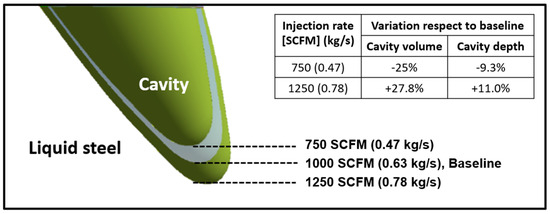 The results obtained by the coherent jet CFD model, shown in Figure 4 and Figure 5, are used to compute the cavities formed in the liquid bath. Figure 6 shows the cavities produced by the 750, 1000, and 1250 SCFM injection rates, and the variations in the volume and depth of the cavities with respect to the baseline case (1000 SCFM).