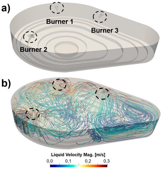 The baseline case considers oxygen injection at a rate of 1000 SCFM in all the burners, which operate in lance mode. Figure 7 shows the location of the burners in Figure 7a and the flow patterns associated with such injection rates after 600 s in Figure 7b. The flow pattern shows large fluid velocities near the burners, dropping significantly as the flow changes direction due to interactions with the walls and the flow injected from adjacent burners. Overall, the flow velocity magnitude decreases from around 5 m/s to 0.01–0.5 m/s. Moreover, considering the entire domain, the average velocity is 0.024 m/s in the horizontal direction and 0.068 m/s in the vertical direction. These average velocities agree with those reported in Ref [3]. The flow pattern is particularly non-uniform. The main reasons for the non-uniformity of the flow are the geometry of the furnace, the asymmetric distribution of the injectors, and the angle at which the oxygen is injected.