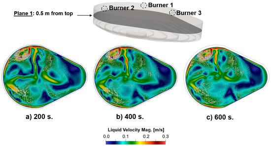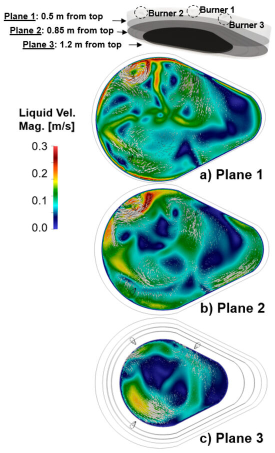 Figure 9 shows the instantaneous velocity magnitude and flow vectors of the liquid steel on three planes, at t = 600 s. The locations of the planes are shown at the top of the figure. The results show that flow intensity is larger near the top planes of the domain (planes 1 and 2) where the momentum is transferred by the jets. The main features observed in plane 1 (Figure 9a) are also seen in plane 2 (Figure 9b). Namely, large velocities develop near burner 1 and on the upper side of planes 1 and 2, towards the left end. Plane 2 is further inside the furnace (Figure 9b) and, overall, it shows similar flow intensity as compared to plane 1. The flow velocities are reduced in plane 3, taken 1.2 m from the surface of the liquid bath. In plane 3, the velocity magnitude does not exceed 0.2–0.25 m/s, although recirculation patterns similar to those observed in planes 1 and 2 are maintained.