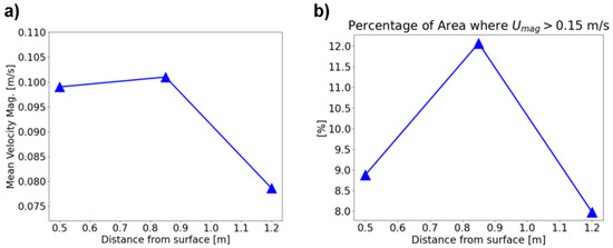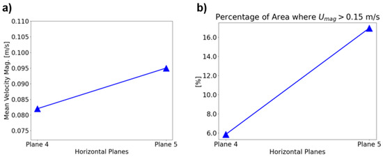 (a) Mean velocity magnitude, and (b) percentage of area where the velocity magnitude is larger than 0.15 m/s for the planes considered in Figure 11.