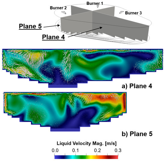 Figure 11 extends the analysis by considering two vertical planes, which are shown at the top of the figure. Figure 11a shows plane 4, which is oriented towards the balcony of the furnace. Plane 4 shows larger liquid velocities on the left side, near the locations of burners 1 and 2. The flow vectors on the left side of plane 4 show a vertical recirculation produced by the interaction of the flow injected at burners 1 and 2 with the bottom of the furnace. Therefore, the asymmetric distribution of the burners at the top of the liquid bath leads to the formation of recirculation structures in the horizontal and vertical directions near burners 1 and 2, as shown in planes 1–3 (Figure 9) and plane 4 (Figure 11a). Figure 11b shows larger flow velocities on plane 5 than on plane 4 due to the vicinity of burners 1 and 3, although the recirculation pattern in this plane is weaker than in plane 4. Planes 4 and 5 show large velocity gradients through the domain due to the asymmetric distribution of the burners and geometry of the EAF. Figure 12 confirms these observations by indicating increases in the mean velocity and size of the region with higher flow intensity in plane 5 with respect to plane 4 of 15 and 183%, respectively.