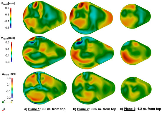 Figure 13 shows the instantaneous velocity components Uliquid, Vliquid, and Wliquid of the liquid steel on planes 1, 2, and 3 discussed earlier. The axis orientation is included at the bottom left of the figure. Figure 13a,b show that the flow intensity is larger on the left side of the planes, near burners 1 and 2. Figure 13b shows that Uliquid and Vliquid increase as the flow interacts with the end wall at the balcony. The Wliquid contours in Figure 13a show the flow structures produced vertically as a result of the oxygen injection. Namely, the oxygen injection produces the stirring of the liquid bath upwards. The Wliquid contours in Figure 13a also show negative velocities associated with the stirring, which determine the recirculating patterns seen in planes 4 and 5 in Figure 11. The overall intensity of flow vertical penetration decreases as we move into the liquid bath, and a much reduced Wliquid contour is observed at the furnace bottom in Figure 13c.