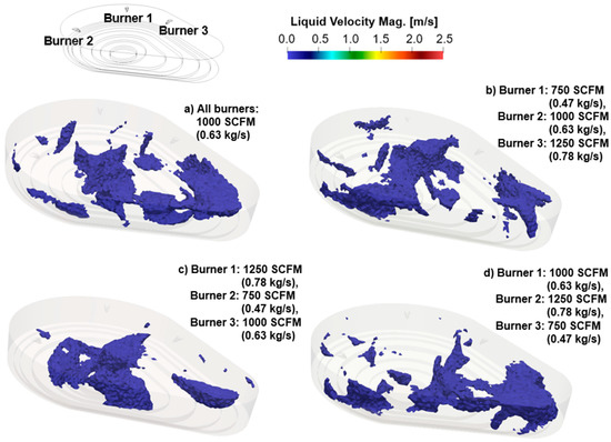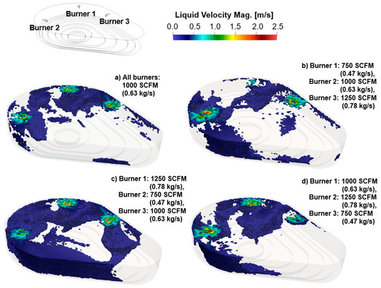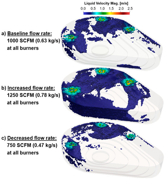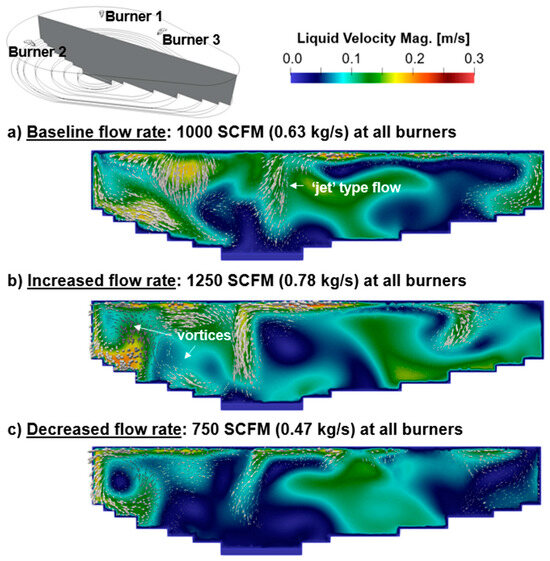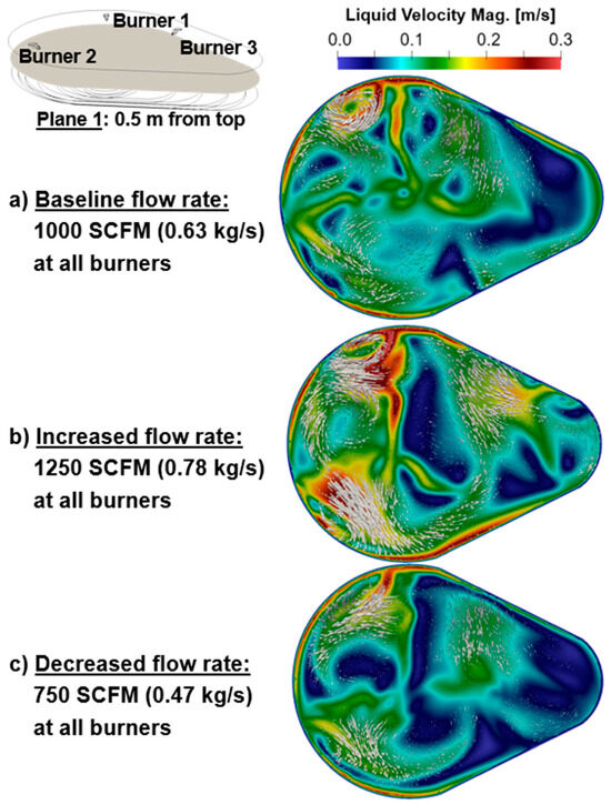 The effect of increasing and decreasing the flow rate in the burners is shown in Figure 14, where these scenarios, in addition to the baseline case, are compared at t = 600 s. Figure 14b shows that the increased flow rate intensifies the flow near the burners, and leads to the formation of a ‘dead zone’ at the center of the furnace, where the flow velocity is negligible. The flow vectors in Figure 14b show a significant increase in the liquid velocity near burners 2 and 3, and near the walls, as compared to the baseline case. Figure 14c shows the case with a decreased flow rate. Here, the flow velocities are reduced throughout the domain, and the dead zone regions are the largest among the three scenarios.