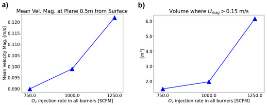 Figure 17 helps to illustrate the impact of increasing and reducing the injection rate uniformly in all the burners. Figure 17a shows that the mean velocity magnitude increases by 10% when increasing the flow rate from 750 to 1000 SCFM, and by 23% when increasing the flow rate from 1000 to 1250 SCFM. However, the impact on the size of the region where the flow velocity is significant (i.e., larger than 0.15 m/s) seems rather exponential, as it increases by 25% when increasing the flow rate from 750 to 1000 SCFM, and 210% when increasing the flow rate up to 1250 SCFM. Therefore, increasing the flow rate has a larger impact on extending the region where the jets stir the bath rather than increasing the liquid steel velocity itself.
