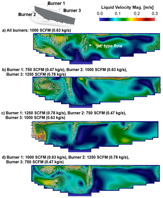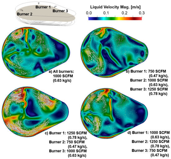 The contours of the liquid velocities and flow vectors of the non-uniform injection scenarios at t = 600 s are shown in Figure 18. In these cases, the flow rate injected by the three burners combined is the same, 3000 SCFM, which differs from cases 1–3 where the total injection rate changed. In cases 4–6, the flow pattern varies significantly depending on the location of the burner that is increased or decreased with respect to the baseline rate of 1000 SCFM. Figure 18b shows the case where the largest flow rates are at burners 2 and 3. In this case, the dead zone region is increased in the center of the furnace as compared to the baseline due to the stirring driven mainly by burners that are located opposite each other. By increasing the flow rate in burner 1 and reducing it in burner 2 (Figure 18c) the largest flow rates are injected near the top side of the plane, where burners 1 and 3 are located. This also increases the flow velocities near burner 2, even though the flow rate in this burner is reduced to 750 SCFM. In this case, the flow velocities are larger than in the baseline case, although a dead zone region is formed in the center of the domain in addition to the one formed at the balcony. Finally, by setting burners 1 and 2 to the largest flow rates while reducing the injection rate at burner 3 (Figure 18d), the flow velocities are intensified as well, but the increase in the flow velocities is mostly on the left side of the plane view, whereas the right side and balcony region are exposed to low liquid velocities.