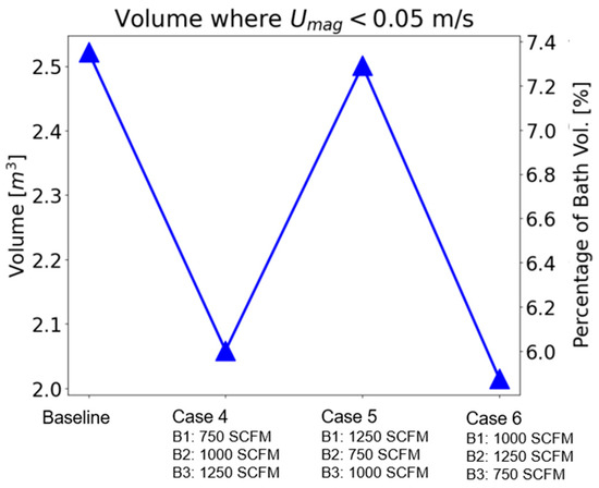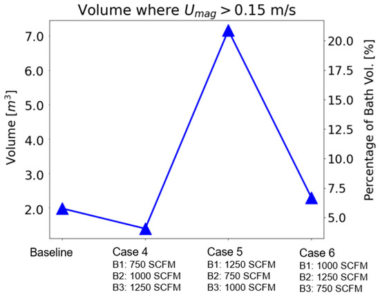 Figure 24 shows the size of the bath regions shown in Figure 23. It is shown that the non-uniform injection rates of the burners reduce the ‘dead zones’ size with respect to the baseline case. This reduction is minimal for case 5, but ~20% for cases 4 and 6. As mentioned earlier, the reduction in the size of the dead zones should have a positive impact on the efficiency of the mixing rate, which will be analyzed in the next section.