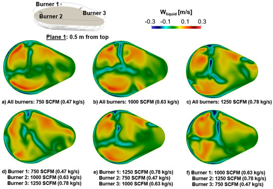 The last set of results presented in this section corresponds to the Wliquid velocity computed at 0.5 m from the top of the liquid bath, for all six cases presented in this study (Figure 22). The Wliquid velocity is the velocity component that is perpendicular to the surface of the liquid bath, and it is expected to have a large impact on the reactions produced in the steel–slag interface and on the slag mixing during the actual operation of the EAF. Figure 22 shows three regions in each of the cases where Wliquid is positive (flow moving towards the bath surface). These regions correlate with the locations of the burners. Interestingly, the case with the reduced flow injection (750 SCFM, Figure 22a) shows larger Wliquid velocities than the baseline case and the case with increased flow injection (Figure 22b,c, respectively). These larger Wliquid velocities are observed near the walls, adjacent to the burners. However, Figure 22a also exhibits the larger regions with negligible Wliquid velocity among the three uniform injection cases.