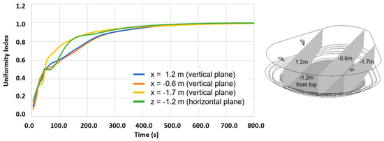 The variation in the uniformity index with time can be calculated locally on selected planes along the simulation. This requires computing the uniformity index on a per area basis rather than per volume as given by Equation (12). Figure 25 shows the uniformity variation with the time of selected planes for the baseline case (1000 SCFM in all the burners). The planes where the uniformity index is computed are shown on the right side of the figure. The results in Figure 25 show how the uniformity index varies in time with the selected location, and how the uniformity index value eventually converges to ~1 at a similar time for all planes, around 640 s. In the results to be discussed next, the mixing time in each of the cases is determined by the time when the uniformity index calculated on a per volume basis (by using Equation (12)) reaches 0.95.