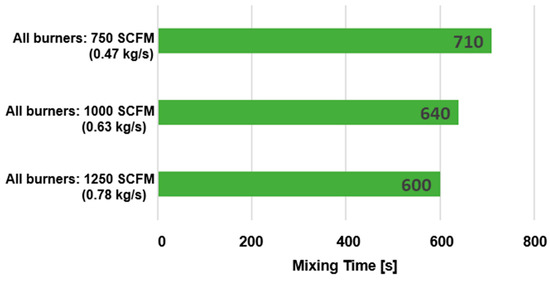 Figure 26 shows the mixing time for cases 1 (baseline, 1000 SCFM in all burners), 2 (1250 SCFM in all burners), and 3 (750 SCFM in all burners). This illustrates the effect of increasing and reducing the flow rate of the coherent jet on the mixing process. Namely, a 25% increase in the flow rate leads to a reduction of 6.7% in the mixing time, whereas by reducing the uniform flow rate by 25%, the mixing time increases by 10.9%.