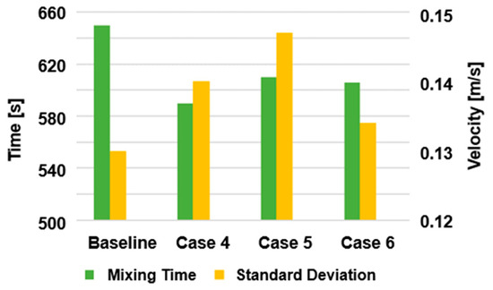 Mixing time and standard deviation of velocity for the baseline case and the cases with individually modified flow injection rates.