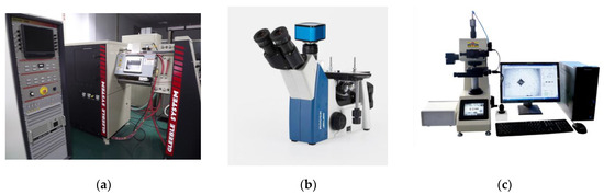 Experimental equipment and flow chart: (a) Gleeble-3500 thermal simulation testing machine; (b) IE500M metallographic microscope; (c) 430SVA Vickers hardness tester.