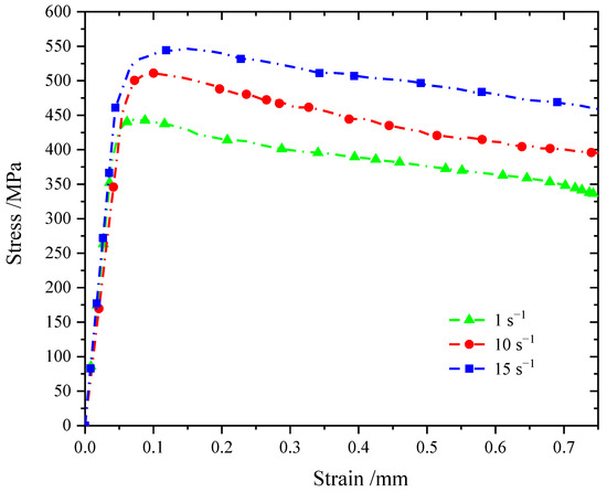 As can be seen from Figure 4, the sample was deformed under upsetting at a warm forming temperature, and the stress-strain curve of 42CrMo steel showed a trend of first increasing to the stress peak and then slowly decreasing, and with the increase in strain rate, the stress-strain curve increased. This is because, with the increase in deformation rate, dislocation density and dislocation proliferation speed increase rapidly in a short period of time, resulting in an increase in peak flow stress [27]. With the increase in compression deformation, the peak flow stress reaches 443.9 MPa, 511.0 MPa, and 546.5 MPa at the deformation rates of 1 s−1, 10 s−1, and 15 s−1, respectively. It can be seen that under the condition of warm deformation, the peak value of flow stress increases with the increase in deformation rate, and in the plastic stage, the stress value slowly decreases with the increase in strain. This change trend is similar to that of the flow curve under cold deformation, but the decreasing trend tends to be gentle. This shows that the softening effect caused by the rise in deformation temperature is gradually reduced under the condition of warm forming.