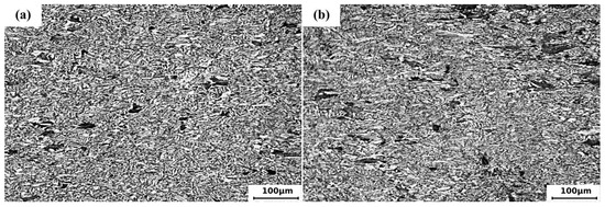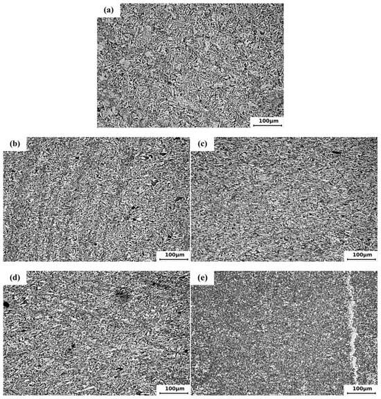 Figure 5a–e shows the optical microstructure of the original 42CrMo sample and strain rate 1 s−1, deformation temperature of 20 °C, 500 °C, 650 °C, and 800 °C, deformation amount of 60%, respectively. The compression direction is from top to bottom. It can be seen from the figure that the grain size varies significantly with the change in temperature. From Figure 5a, it can be clearly seen that the grains of the original sample have relatively evenly distributed ferrite and bainite structures. After compression at room temperature (20 °C), the grain size was finer than that of the original billet, and the grain size was significantly reduced, as shown in Figure 5b. which is due to the upset force that causes the larger grains to break up and form fine grains [28]. The grain of the sample at 500 °C is further stretched and broken compared with that at 20 °C. However, the sample with a temperature of 650 °C has strip and block grains again, which is due to the upsetting deformation at 650 °C coupled with the deformation temperature rise, and the action of thermal activation makes some dislocation defects disappear or recombine, resulting in the recovery of fine broken grains and some growth. When the sample is compressed and deformed at 800 °C, the grains inside the sample are the smallest and most uniform. This is because the sample is heated to 800 °C, the austenite region above the AC3 temperature of 42CrMo is subjected to rapid compression and deformation, and a fine grain structure is formed after air cooling. However, as can be seen from Figure 5e, due to the phase transformation of the steel during the cooling process after the warm upsetting deformation, the ferrite preferentially extends in the dendrite segregation and non-metallic inclusion and precipitates out in a band along the metal flow direction, resulting in a local band structure [29]. It can be seen that the grain can be refined by upsetting deformation at 500–650 °C, and the grain refinement mechanism is mechanical crushing and refining. When the temperature is slightly higher, the broken grain will recover, and the size will grow.