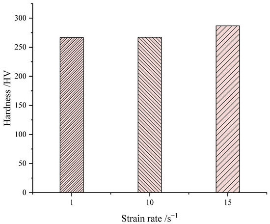 As shown in Figure 7, Vickers hardness values at 650 °C and different strain rates show that when the temperature is 650 °C, and the strain rate is 1 s−1 and 10 s−1, the hardness values of the samples have little difference, while the hardness values of the samples with a deformation rate of 15 s−1 increase, reaching 286.9 HV, indicating that a higher strain rate can increase the hardness.