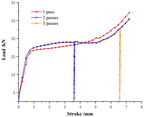 Figure 12 shows the simulation comparison of stroke-load curves for single-pass and multi-pass at a temperature of 650 °C and a strain rate of 1 s−1. It is found that the stroke–load curves of a single pass are in good agreement with the stroke–load curves of two passes and three passes, and the load difference is small.