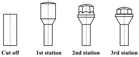The process scheme of warm upsetting for automobile tire bolts is shown in Figure 13: The first station is necking; the second station has a hexagonal head and flange pre-upset forming; and the third station flange is finally upset forming. According to the deformation degree equation, the maximum deformation degree of each station is 38.3%, 0.17%, and 2.78%; all of them are less than the allowable deformation degree of 42CrMo material under cold forming, which meets the design requirements.