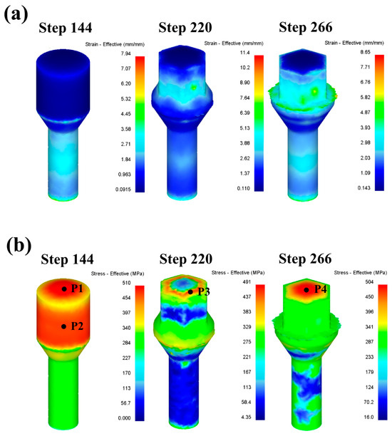 Figure 15 shows the distribution diagram of equivalent strain and stress after forming at each station. It can be seen from the diagram that the maximum equivalent strain at each station is mainly distributed at the maximum deformation of each station, among which the first station is mainly reduced in diameter, the material at the lower end of the billet is squeezed, the metal flows to the reduced mold cavity, the deformation is large, the contact area between the upper end of the billet and the mold increases, and the friction also increases due to the restriction of the forging mold cavity. Therefore, the deformation stress in the P1 and P2 regions at the upper end of the billet is large, as shown in Figure 15b. The second station is mainly formed for the hexagonal head and flange pre-upsetting. Because the lower end of the hexagonal head and the upper end of the flange are not bound by the mold, the strain is larger. The final forming part of the second station is the arc position of the top of the hexagonal head, and the arc of the top is smaller than that of the first station; the maximum stress distribution position of the top of the hexagonal head is a ring, and the maximum stress point is P3. The third station is the final upsetting stage, and each position has different degrees of deformation, among which the largest deformation position is the flange, and the equivalent strain value is also the largest. The whole part is completely covered by the mold, which makes the overall stress larger, and the maximum stress point is in the P4 area at the top of the hexagonal head. Due to the relatively complicated deformation of the hexagonal head, there is a flying edge around the hexagonal head when it forms at the third station. Subsequent trimming is required.